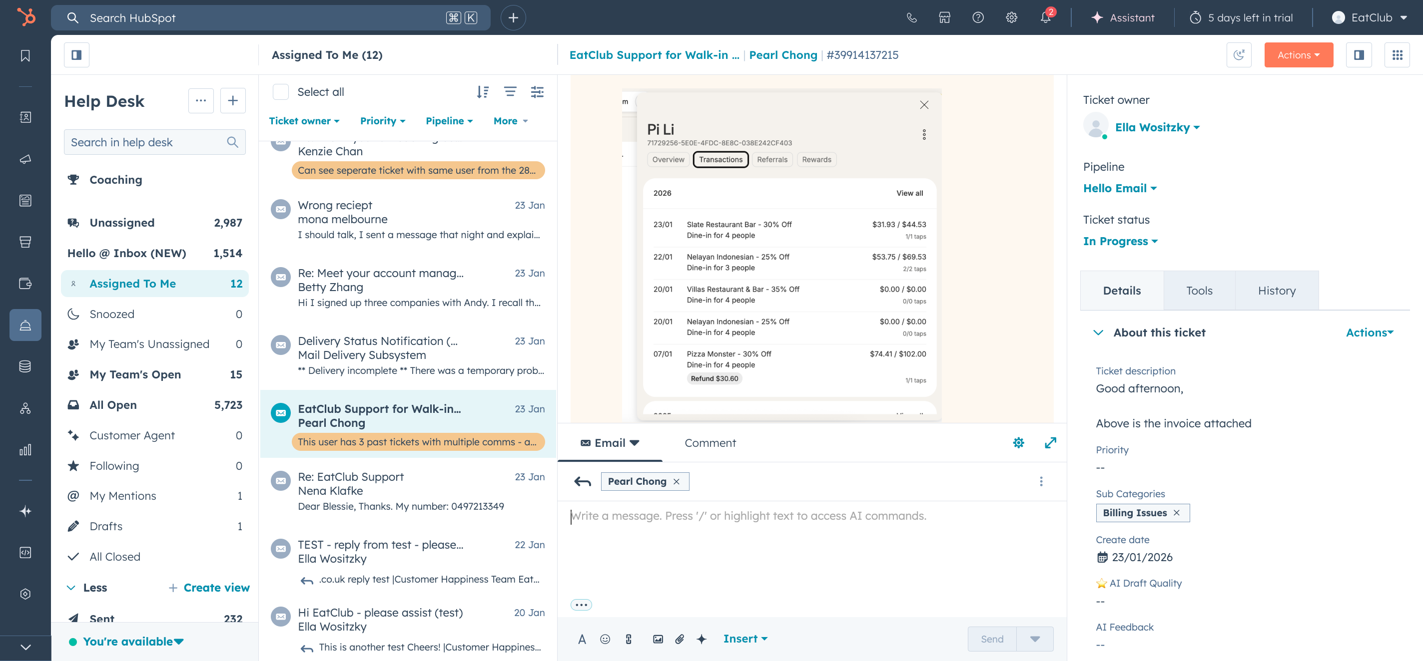 - When you change a ticket's Status from New to In Progress, HubSpot automatically removes it from the Hello @ Inbox view and places it into the Hello emails in progress view.
