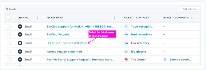 Click on the 'Ticket Name' to open the ticket.