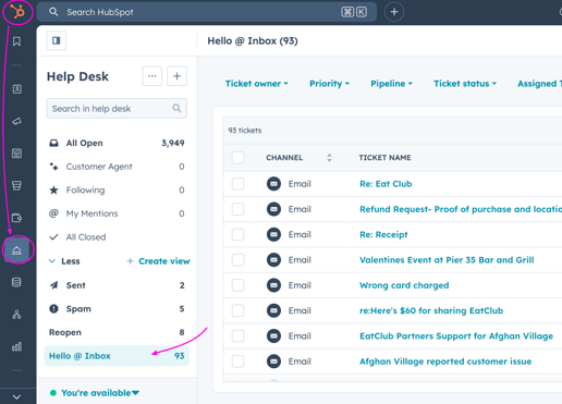 - Navigate to: HubSpot → Help Desk→ “Hello Inbox” view.